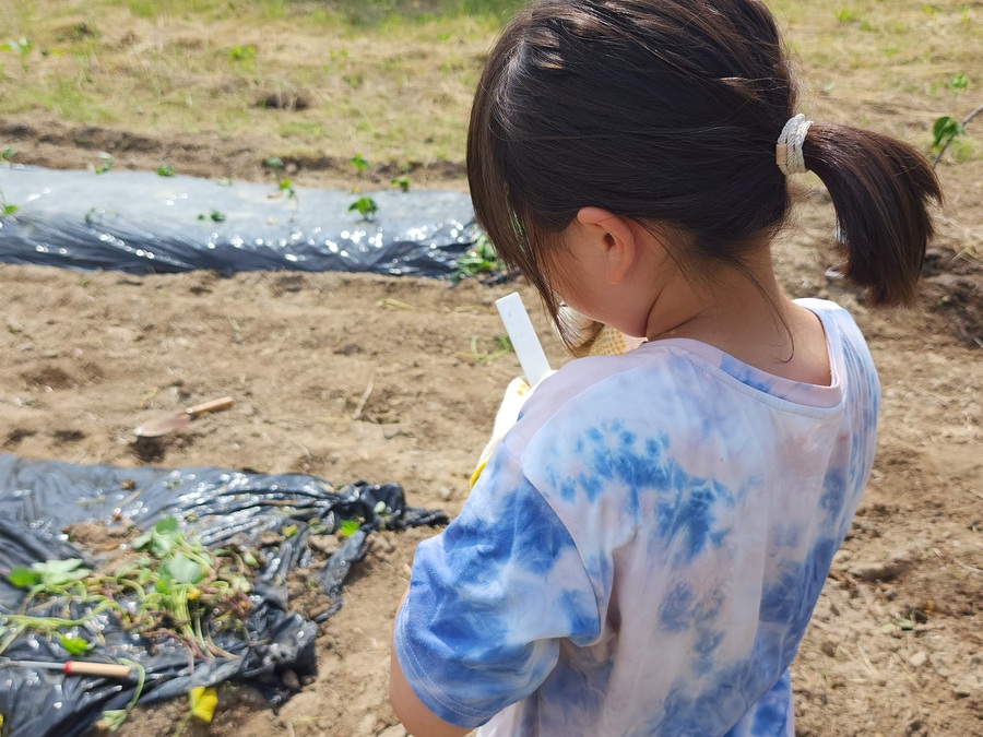 今年植えた苗は「紅あずま」と「紫芋」。植えた苗のそばに自分の名前を書いた札をたてました。秋の収穫が楽しみです。